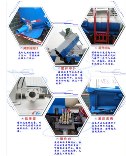 東風小多利卡4噸餐廚垃圾車常規標配: 罐體采用4mm優質Q345錳板制作,圓形罐體,罐體前后封頭采用圓弧蝶形封頭,罐體尾端及罐體后封頭外加25~30mm厚法蘭,罐體與后封頭上部采用鉸鏈連接,后封頭可利用液壓油缸打開卸料;罐體右側前部裝有掛桶提升機構裝卸桶裝垃圾,掛桶提升機前側裝有圓形液位計;罐體后部兩側安裝液壓油缸實現罐體舉升自卸。后蓋采用液壓鎖緊,室外手動液壓操作。