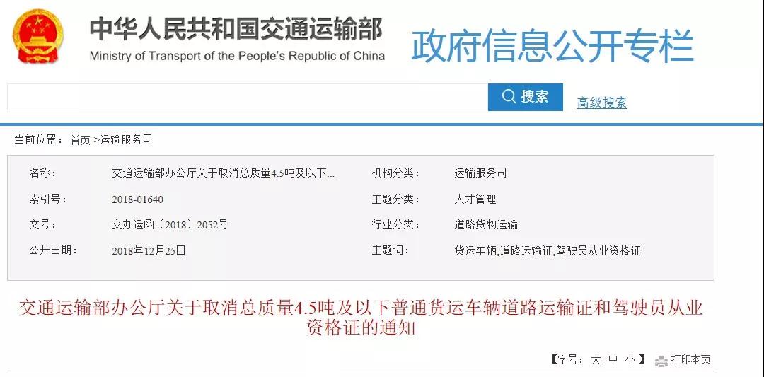 一、自2019年1月1日起,各地交通運輸管理部門不再為總質量4.5噸及以下普通貨運車輛配發道路運輸證。