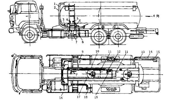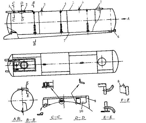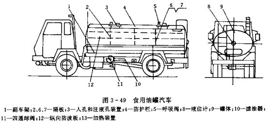 圖3-49是食用油罐車外形圖,主要由汽車底盤,油罐總成,廢氣加熱裝置和油路系等組成。罐體為雙層保溫罐體,橫截面為橢圓形,上部有人孔和注液孔裝置3,人孔蓋上裝有呼吸閥5.副車架1與罐體9焊在一起,用螺栓緊固在汽車車架上。罐體后封頭中部裝有液位計8 ,罐內設有隔板和縱向,橫向防波板。