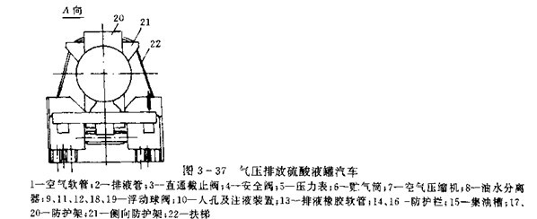 動力排放硫酸罐車大多采用氣壓排液方式(見圖3-37)。罐體橫截面為圓形,中間用球面形隔板分前、后兩艙。罐內設有縱向防波板,罐體上部設有防護架,前、后艙內的前端增多有一根垂直的排液導管,其下端伸至罐底的凹槽處,以減少剩余量,其上端與放液閥相通。