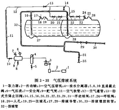 氣壓排放系統如國科3-38所示,壓縮空氣從壓縮機排出,經油水分離器4貯氣筒9空氣軟管11臥式升降止回閥13后分兩路到達前、后艙。排液時,硫酸經閥15、16,排液管32、閥29、31、從排液軟管排出。注液時,只需打開閥21、23,使前,后艙,經閥15、16,排液管32,閥29、31,從排液軟管排出,注液時,只需打開閥21、23,使前、后艙與大氣相通,再將地面輸液軟管插入注意孔19、25即可。開啟或關閉不同的閥門,可進行不同的作業。該車可以雙艙同時排液,也可單艙分別排液。