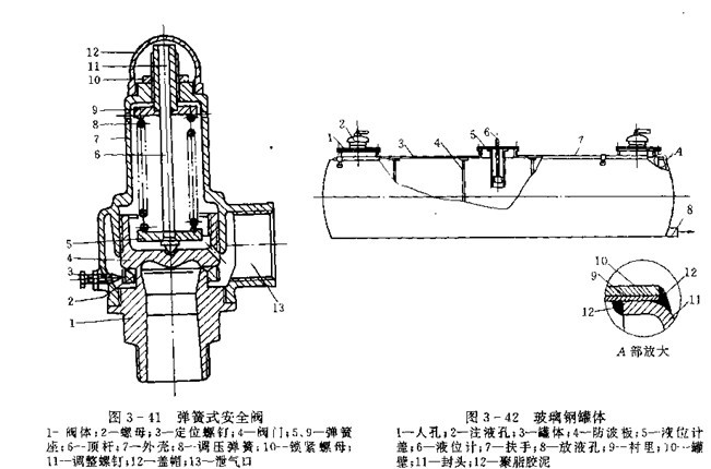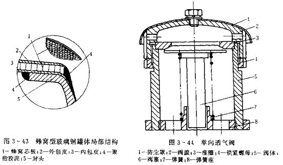 一般碳鋼(包括不銹鋼)和鋁合金均不耐鹽酸的腐蝕,故常用罐體有鋼制襯膠罐體和玻璃鋼缸體兩種。排液方式有重力排放和氣壓排放,玻璃鋼缸體耐腐蝕好,質量輕,修理方便。但強度較低,承受內壓較小,常在罐體外用鋼制環箍加強,排液方式也采用重力排放。玻璃鋼罐體如圖3-42所示。圖3-43為蜂窩型玻璃鋼罐體部分 放大結構,其罐體橫截面為橢圓形,外包皮2和內包皮3均為厚度較小的聚脂玻璃鋼,中間夾層蜂窩芯板1是用六邊形的孔狀玻璃纖維布膠合而成,封頭5用厚度較大的聚脂玻璃制成。為防止排液時罐內出現局部真空,在人孔蓋上應裝單向透氣閥(見圖3-44)。當罐內鹽酸減少出現真空度時,因閥蓋2上的小防能與大氣相通,故閥塞6在大氣壓力作用下壓縮彈簧7,透氣閥打開,罐內壓力上升,直至與大氣壓平衡時透氣閥再關閉。