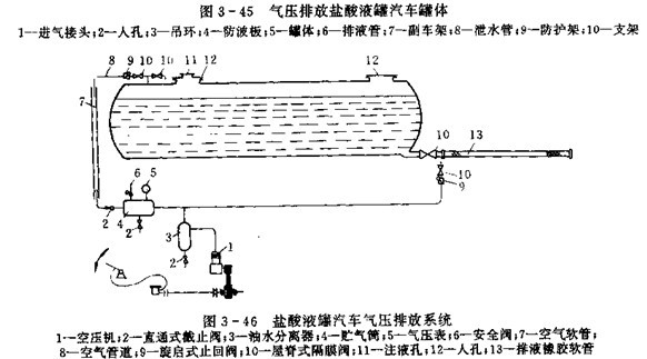 采用氣壓排放的鹽酸液罐車要用橫截面為圓形的鋼制襯膠罐體,內表面有5mm厚的天然橡膠襯里,在汽車底盤上安裝成前高后低的傾斜狀態。圖3-45為氣壓排放的罐體結構圖,圖3-46為氣壓排放系統圖。