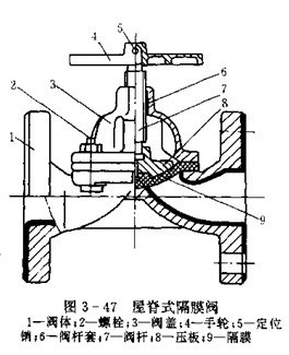 屋脊式隔膜閥是氣壓排放系統中的主要部件,如圖3-47所示。閥體1的內表面和端面均敷以天然橡膠襯里,隔膜9也用天然橡膠制成,在鹽酸通過閥門時只與橡膠接觸面不與其它零件接觸,可防止腐蝕。旋轉手輪4可實現閥的開啟和關閉。