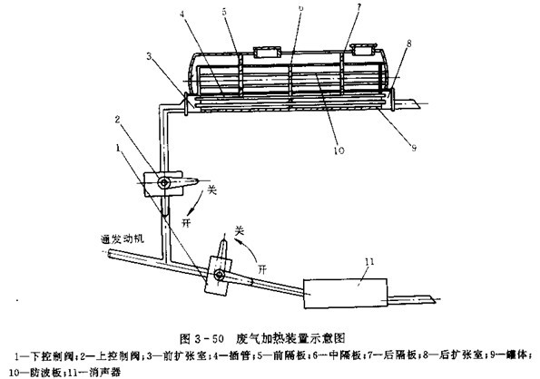 加熱裝置是用來防止食用油在低溫運輸時凝固,以免造成裝卸困難。該車的加熱裝置是利用汽車發動機排放的廢氣余熱加熱油液。圖3-50為廢氣加熱裝置示意圖,需要加熱時,打開上控制閥2,關閉下控制閥1,發動機排出的廢氣經上控制閥2,前擴張室3、插管4(呈三角排列)對罐體進行加熱,然后廢氣經后擴張室8排入大氣。不加熱時,關閉上控閥2,開啟下控制閥1,發動機排出的廢氣經排氣管,消聲器直接排放大氣。為防止廢氣的腐蝕,插管和前、后擴張室均采用不銹鋼制造,并且每年要至少一次清除插管內的積碳。