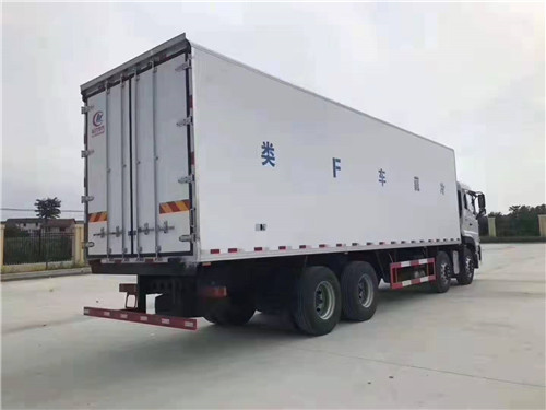 東風(fēng)天龍前四后八廂長9.4米冷藏車保溫廂體配置: 車廂內(nèi)尺寸 (長x寬x高)mm: 9400*2440*2450,冷藏廂體采用內(nèi)外飾玻璃鋼;中間夾層保溫材料采用聚氨酯切片真空負(fù)壓一次復(fù)合成型;厚度8cm, 符合國家衛(wèi)生部頒布食品等級要求,具有強(qiáng)度高、耐腐蝕、抗老化、導(dǎo)熱性能低、無污染、不容易損壞等特點(diǎn),底板為鋁合金防滑花紋板,保證底板保溫性能及底板的抗沖擊強(qiáng)度。雙后開門門框架全部采用玻璃鋼制成的整體框架,門板重量輕,防腐性能好。雙后門中縫帶斜度,開關(guān)方便。門邊框密封采用進(jìn)口優(yōu)質(zhì)橡膠(三元乙丙)密封條進(jìn)行密封,保證廂體保溫效果的穩(wěn)定性,門邊,門鎖及附件均為不銹鋼制作。