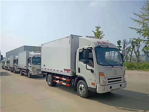 國五大運廂長4.1米冷藏車上藍牌不超重批量發車如下圖:
