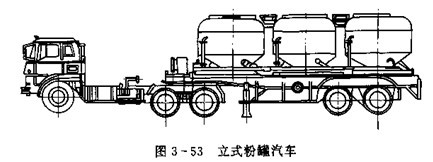 立式粉罐汽車的罐體中心線呈鉛垂方向,如圖3-53所示。車輛可載一個或多個立式罐。立式粉罐汽車適用范圍廣,能用于粉料,顆料料等多種粉粒體物料的散裝運輸。但整車質心較高,采用多個罐體時結構復雜,制造成本也較高。