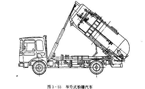 舉升式粉罐汽車在裝料和行駛時,罐體中心線處于水平位置,卸料時舉長機構將罐體前端升起,成傾斜狀態(tài),如圖3-55所示。舉升式粉罐汽車的罐內底部通常僅在出料口處設置流態(tài)化床,卸料進罐體呈傾斜狀態(tài),粉粒在重力作用下啟動下自動下滑,集中到出料口處后合卸出。所以,罐體內部結構簡單,容積效率高,適用范圍廣,常用來裝運流態(tài)化性能差的粉料。但由于增加了舉升機構,使用、維修復雜。
