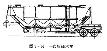 斗式粉罐汽車的罐體由中心線呈水平位置的直圓筒或長方筒和與中心線垂直的錐筒組合而成,如圖3-56所示。斗式粉罐汽車通常不設置流態(tài)化床,利用粉料的重力自動卸料。所以,具有結構簡單,適用范圍廣。剩余量少,罐內易于清掃等優(yōu)點。