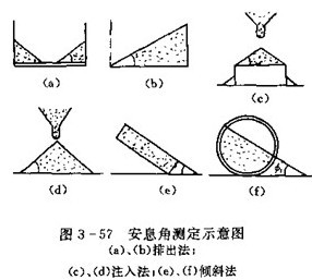 (3)安息角 在散堆粉料時形成的錐體母線與底面的夾角稱為靜態(tài)安息角;當堆放時還受到振動而形成的安息角稱為動態(tài)安息角。安息角的測定方法參見圖3-57。安息角的大小與粉料的粒度、內摩擦角和粘附性等因素有關。