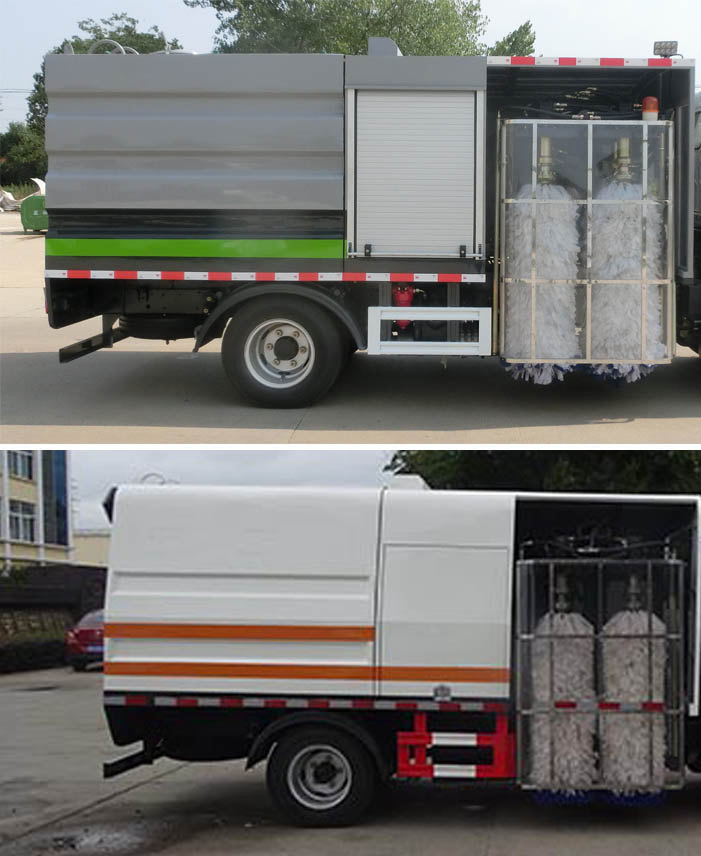 車輛清洗作業(yè)時(shí)可開啟車輛行走減速裝置,可控制車的速度有效保證潔洗率,采用智能控制系統(tǒng)(電液化控制)液壓系統(tǒng)集中控制,操作簡單,駕駛室內(nèi)可完成各種操作后尾部LED箭頭燈。洗洗裝置位于駕駛室后左側(cè),采用雙面清洗裝置,四個(gè)刷子夾緊護(hù)欄轉(zhuǎn)動(dòng)刷洗,高壓水輔助沖洗,電液控制作業(yè)方式對(duì)隔離護(hù)欄清洗作業(yè),噴頭前后6--8個(gè),車輛有高低壓水路系統(tǒng),方便選擇使用。