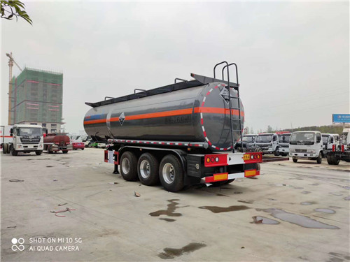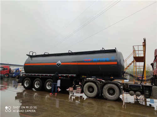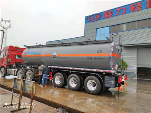 28立方腐蝕性物品罐式運輸半掛車采用適用于牽引危險品半掛車的牽引車。選裝不同樣式的擋泥板,可選工具箱位置。可選裝襯塑工藝。運輸類項號:8,罐體有效容積:26.9立方米,罐體尺寸:長9400mm,直徑(前/后)1950