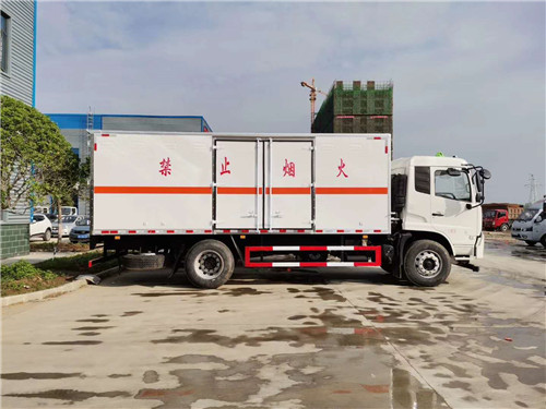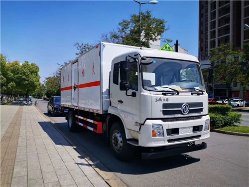 東風天錦8類腐蝕性物品廂式運輸車該車專用于運輸危險貨物為危險貨物運輸車,廂體頂部封閉,不可開啟。隨底盤選裝駕駛室。該車主要用于運輸具有獨立容器(瓶)包裝的氨溶液(氨水),甲醛溶液,除銹磷化液(除銹磷化處理劑),電池,電池液,木餾油,類項號:8。安全裝置為導靜電帶,用于防止靜電。整車長/軸距/后懸對應關系為(mm):9000/5000/2570,8600/4700/2470,8400/4500/2470。