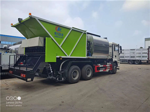 國六陜汽德龍后八輪同步碎石封層車整車型號CLW5250TFCS6型同步碎石封層車,底盤型號:SX1259MC4C1,總質量:25000kg,額定載質量(Kg):7070,整備質量(Kg):17800,駕駛室準乘人數(人):2人,軸數:3人,外形尺寸(mm):9650,9850,10250,10450,10850,11450,11650×2550,2500×3800mm, 國六陜汽德龍后雙橋同步碎石封層車底盤采用陜汽德龍駕駛室,國六濰柴350馬力發動機型號WP8.350E61,軸距:4375+1400mm。