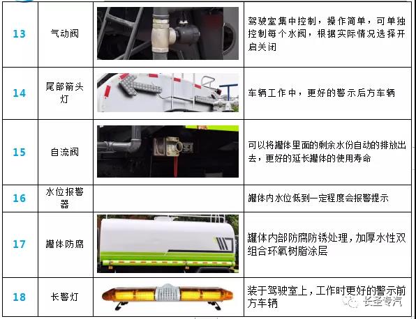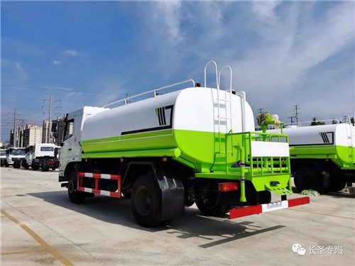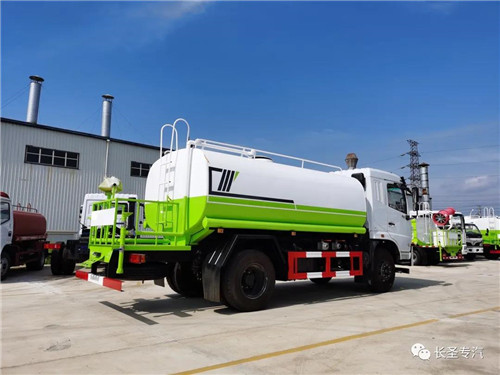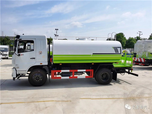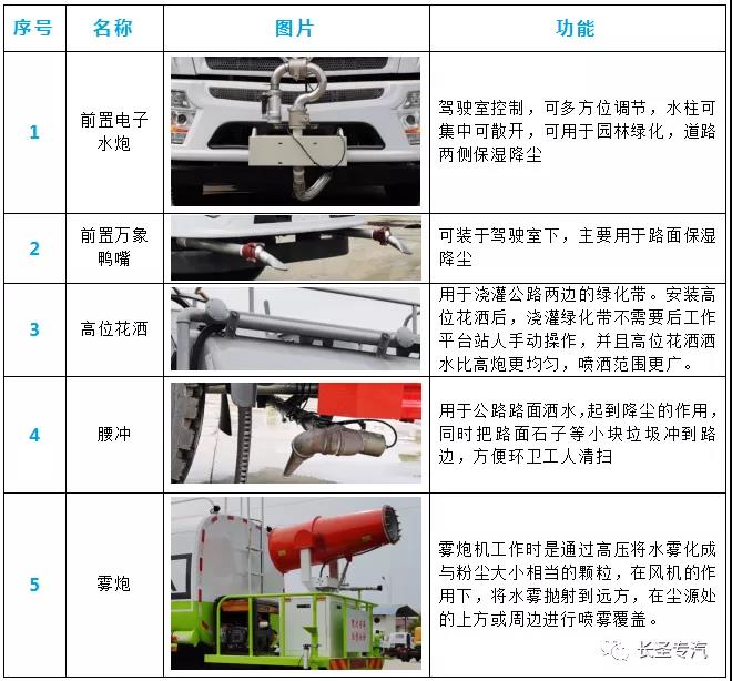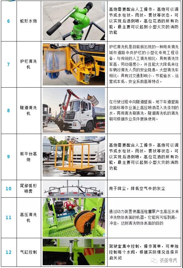 我公司生產灑水車,標配前沖、后灑、側噴、后置式工作平臺、平臺上有高壓水炮(可360°旋轉,可調成柱狀最大射程35米,也可調成霧狀最大射程15米,可調成:直沖狀、大雨、中雨、小雨、毛毛雨),配備優質大功率專用灑水泵,取力器,雜物過濾網,國標通用65型消防接口(可通過消防栓加水)、1套自流球閥系統(可自吸自排,可從河里或池塘抽水到罐體,最大吸程7米),2根引水鋼絲膠管。水泵、取力器、球閥、濾網均為國家標準產品,主管道加粗,法蘭墊、法蘭盤加厚,萬向前沖,大通徑球閥,具有性能優良,工作可靠、效率高、流量大、維修方便等特點。