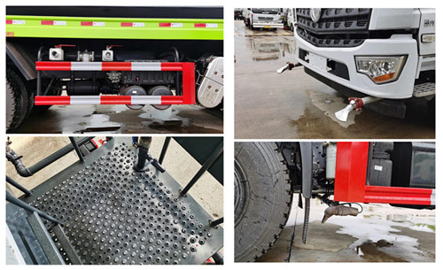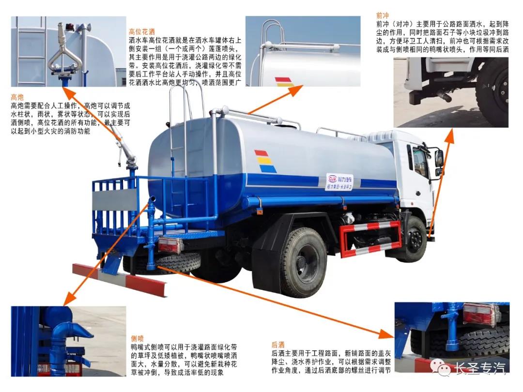 武鋼優(yōu)質(zhì)碳鋼制作罐體,罐體厚度4mm,主管道76,前沖改萬象鴨嘴,加裝中沖,后尾部加弧形噴霧,后灑、側(cè)噴、高位花灑、后工作平臺、360度可調(diào)節(jié)綠化水炮,自流閥、濾網(wǎng)、消防接口(可連接消防栓取水,可作應急消防用),罐前量管(觀察罐內(nèi)水位)、罐后爬梯、罐上簡易罐口、帶簡易護欄、罐側(cè)雙炮筒、炮筒內(nèi)3米長鋼絲塑膠抽水管兩根,罐體表面雙層油漆工藝,防銹、耐腐蝕,其余由廠家標配。