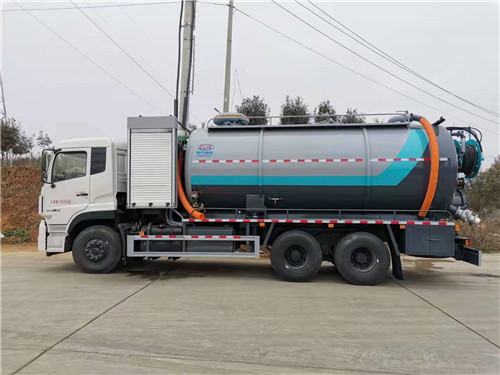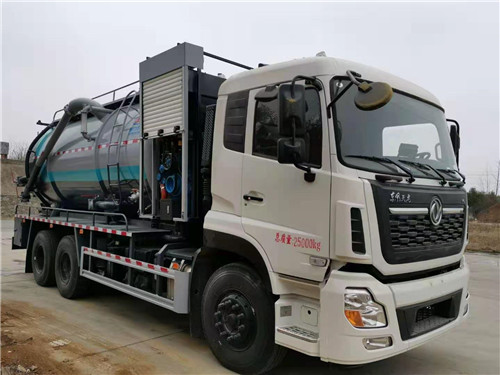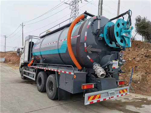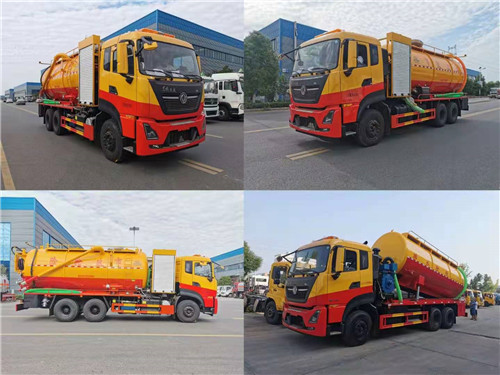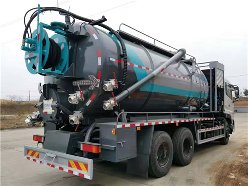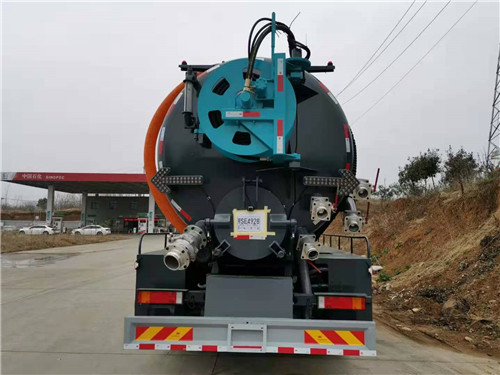 (2)東風天龍后八輪清洗吸污車上裝配置:罐體容積約23方,8m碳鋼板材,清水約5方,其余為吸污,兩倉球閥互通。兩倉中間用封頭,品浮330流量高壓清洗泵,配60米高壓管。選裝安裝山東昊賽42水環泵配420馬力副發。卷盤裝后封頭180度旋轉,后封頭液壓打開。后封頭上一個600水泥蓋放污,可液壓開啟,側面一個6寸不銹鋼偷排閥,后封頭一個6寸不銹鋼出口,一個100寸進口直通罐頂,罐內鋪不銹鋼板,加強型車架,自卸車設計,罐體尾部箭頭燈,帶一個視污窗口。帶8米吸污管。其余廠內標配。