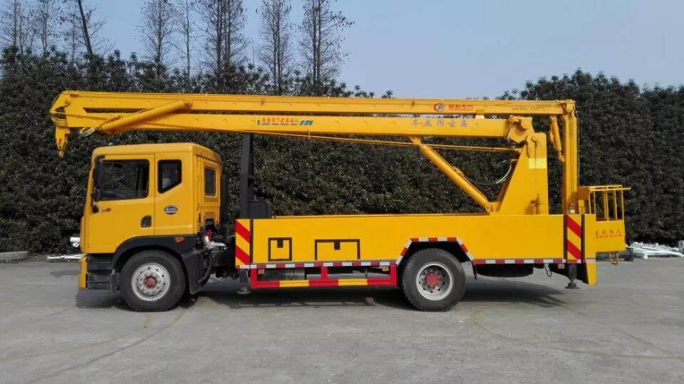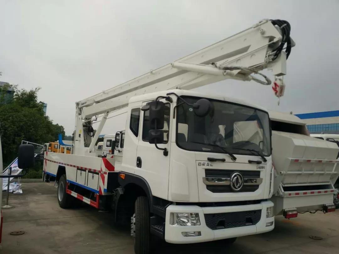東風D9型22米高空作業車采用折疊式曲臂結構,作業臂為三節折疊式,工作斗和轉臺雙工作位,上下操作,電液控制,可360度回轉,四液壓支腿,工作斗內可控制發動機啟停,大臂帶卷揚吊鉤系統,吊鉤吊重≤900kg,載人工作斗承重200公斤,鋼制工具箱和花紋防滑走臺板,不銹鋼圍欄。