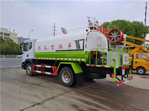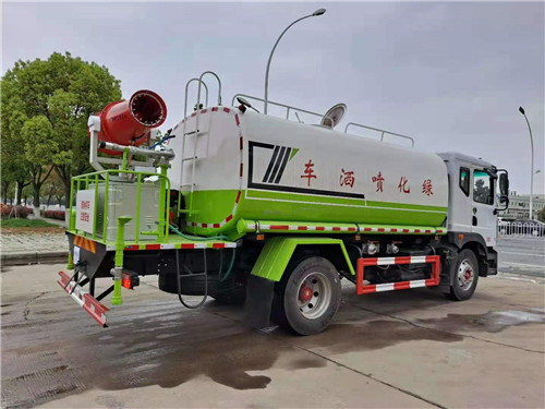 國六東風D9灑水車,14.6噸灑水車上裝配置: 罐體容積14.6方,罐體用4MM碳鋼板制作,罐內隔板具有防波作用,以減低汽車行駛時罐體液體的沖擊。整車帶一個專用灑水泵60/90(垂直最大吸程6米),灑水寬度14米,射程28米。多功能灑水車配備2個前沖(噴)(能將路面泥巴、塵土、垃圾沖干凈);2個后灑(能均勻地將水灑在路面,一次灑水寬度14米)、2個側噴(花灑)(能均勻地將路旁綠化帶澆灌)、帶1個后工作平臺,平臺上安裝1個綠化灑水高炮(灑水炮可全方位旋轉,可連續調成直沖狀、大雨、小雨、毛毛雨,霧狀可調節沖洗高大樹木),引水時間<5min,流量90m3/h。帶1個消防接頭,帶1個自流閥,1個過濾裝置、人性化爬梯及側防護欄,安裝灑水音樂喇叭。
