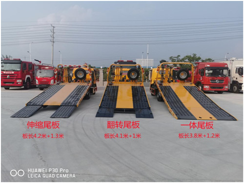 伸縮板:3噸上裝,4噸卷揚,21米鋼絲繩,3噸后拖臂,底板為花紋板(可選沖壓板),主板長4.2米,尾部液壓伸縮板,板長1.3米,雙側聯動操作,配四根捆綁帶,輔助小車一套,L型抱胎架一對,工具箱一個,LED工作照明燈一對,其余標配。