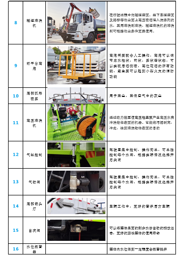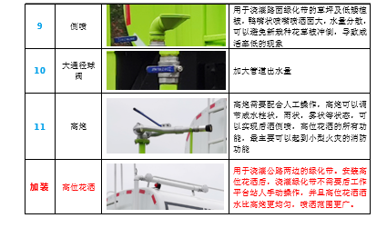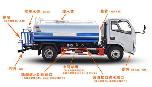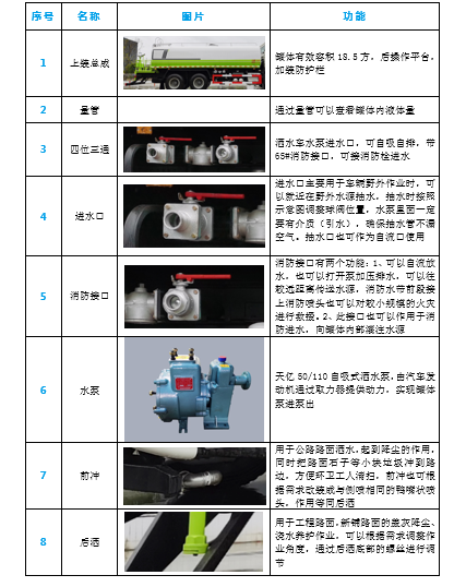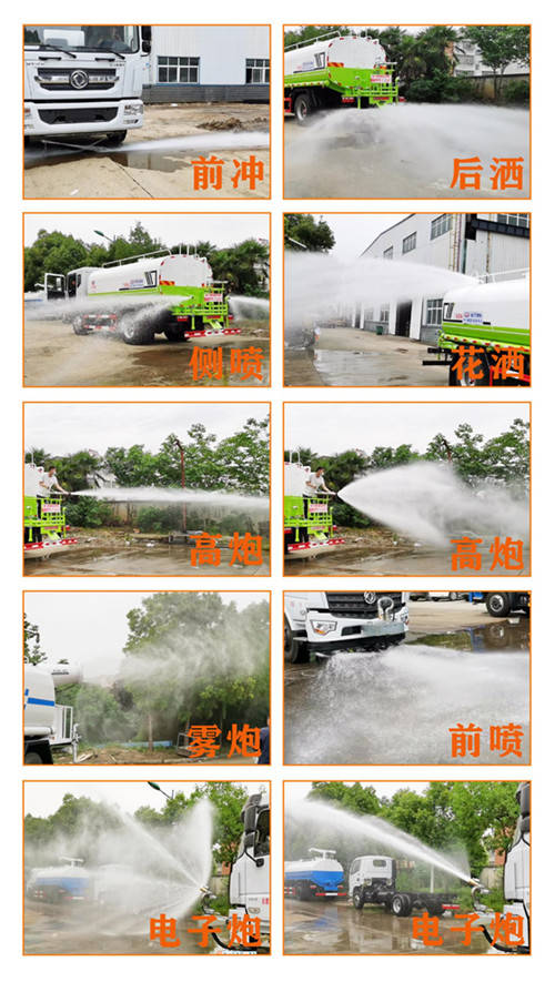 我公司生產灑水車,標配前沖、后灑、側噴、后置式工作平臺、平臺上有高壓水炮(可360°旋轉,可調成柱狀最大射程35米,也可調成霧狀最大射程15米,可調成:直沖狀、大雨、中雨、小雨、毛毛雨),配備優質大功率專用灑水泵,取力器,雜物過濾網,國標通用65型消防接口(可通過消防栓加水)、1套自流球閥系統(可自吸自排,可從河里或池塘抽水到罐體,最大吸程7米),2根引水鋼絲膠管。水泵、取力器、球閥、濾網均為國家標準產品,主管道加粗,法蘭墊、法蘭盤加厚,萬向前沖,大通徑球閥,具有性能優良,工作可靠、效率高、流量
