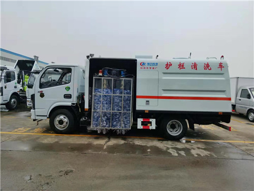 國六東風多利卡護欄清洗車產品簡介: 公司根據市場需求,自主研發設計了該護欄清洗車。機械化清洗作業不僅提高了護欄清潔工作的工作效率,同時也提高了環衛工人護欄清洗工作的安全性,具有工作效率高,清洗作業安全可靠等特點。 1、采用雙面清洗裝置,四組滾掃夾緊隔離護欄轉動洗刷、高壓水輔助沖洗、電液控制的作業方式對隔離護欄進行清洗作業,確保全方位清洗隔離護欄,無清洗死角。 2、副發動機離合器采用程控自動離合,操作人行化,提高了副發動機的工作可靠性和使用壽命。