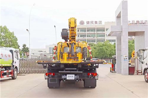 國六東風天錦黃牌清障車上裝配置;6mm厚花紋板,尾部帶翻轉,一拖二帶托臂,1個80KN液壓絞盤(帶25米鋼絲繩),8噸上裝,8噸3節式后托臂,上裝8噸四節臂吊機,上位操作,最大半徑11米舉升高度13米,全液壓全回轉,360度旋轉,固定液壓后支腿,板長6.5米。