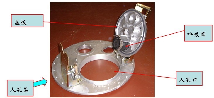 (4)罐體部分---人孔蓋:人孔蓋由螺栓緊固在罐口頸板上,蓋板安裝有呼吸閥。呼吸閥一般為外購產(chǎn)品.