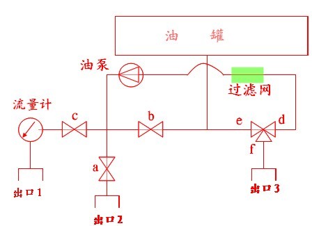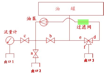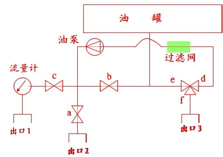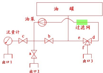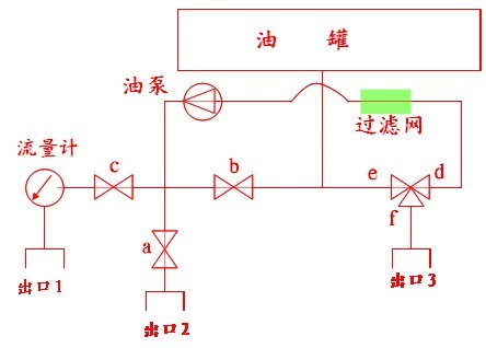 油經出油口三通球閥→濾網→ 油泵→球閥b→油罐(其中a、c、e均關閉) 。