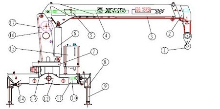 1、吊鉤組件 2、伸縮臂(二節(jié)) 3、基本臂 4、伸縮油缸 5、幅度指示器 6、變幅油缸 7、回轉(zhuǎn)支承 8、活動支腿 9、垂直支腿油缸 10、水平支腿油缸 11、固定支腿 12、支架 13、回轉(zhuǎn)底座 14、操縱機(jī)構(gòu) 15、液壓油箱 16、轉(zhuǎn)臺 17、起升機(jī)構(gòu)
