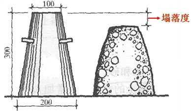 將混凝土裝入下圖所示的標準容器中,將容器提起后,混凝土高度的落差;如圖所示