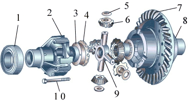 1-差速器殼軸承;2和8-差速器殼體;3和5-調整墊片;4-半軸齒輪(兩個);6-行星齒輪(兩個或四個); 7-主減速器從動錐齒輪;9-行星齒輪軸。 3 差速器的工作原理和工作狀態: